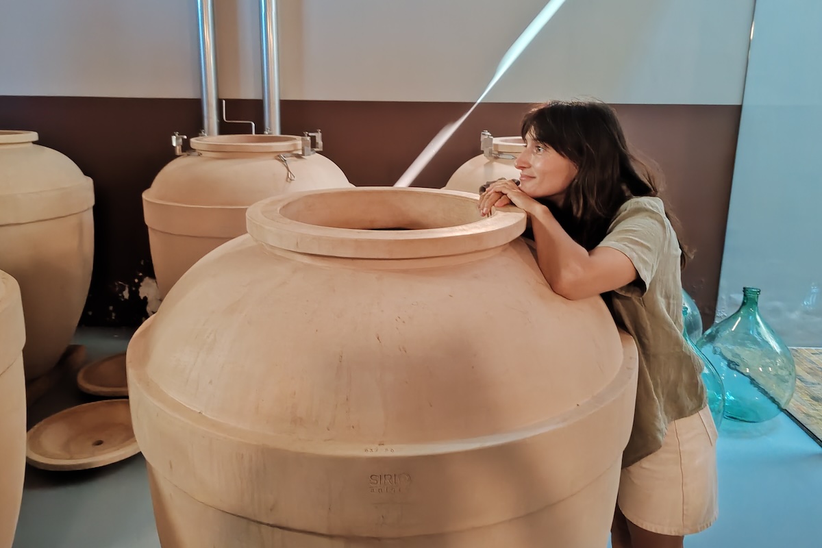 Le anfore in ceramica, poi, come il cemento possiedono pareti spesse e microporose: "Fanno passare un po' di ossigeno. Le usiamo per fare un Pampanuto bianco e un Nero di Troia rosso. Entrambi vengono messi all'interno delle anfore e lasciati maturare con le bucce per circa un anno. Ho scelto queste due varietà perché hanno una buccia più spessa e perché sono le due varietà locali che vorrei valorizzare secondo un approccio più lento, manuale ed espressivo. In questo modo le uve non vengono sempre mescolate e i solfiti vengono estratti in maniera lenta ed elegante".